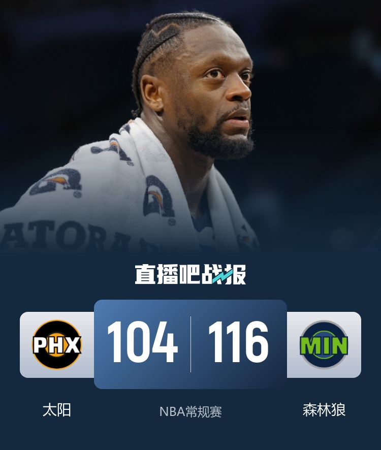 开场后太阳在外线展现出不俗手感接连命中三分,一度取得10分优势,森林狼逐渐找到手感追赶比分,布克连续打成2+1回应,不过在布克下场休息后森林狼继续追分将分差缩小。第二节上来森林狼在外线也有不错手感,两队你来我往陷入僵持,第二节太阳连续进攻受阻,森林狼在半场结束前反超1分。易边再战,场上局面依旧十分胶着,布克带队紧咬比分,森林狼总能及时回应。末节决战,森林狼上来利用布克休息的时间将分差拉大到两位数,杰伦·格林依旧表现不佳,太阳在进攻端始终无法打开局面,森林狼一直将两位数优势保持到最后,最终森林狼116-104送给太阳3连败。