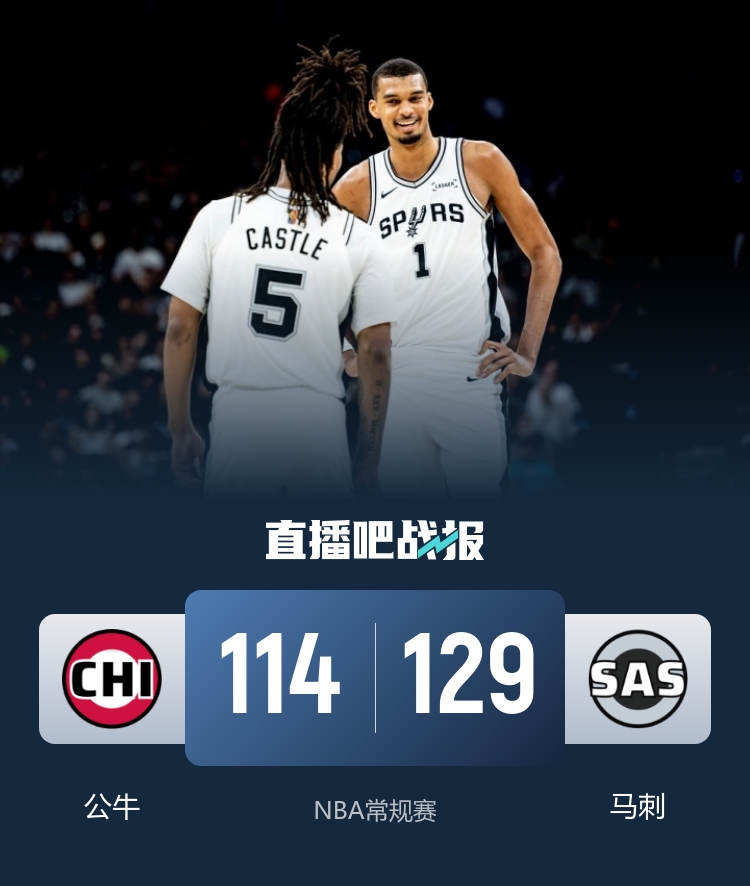 开场后公牛一度多点开花抢占先机,文班亚马在内线攻防两端都展现统治力帮助马刺反超比分,但马刺首节外线手感不佳,公牛倒是手感不错跟马刺打得有来有回。第二节上来两队都是连续打铁,巴恩斯补篮打破僵局,随后马刺外线找到手感逐渐建立起领先,公牛外线一直没有能够找回手感,半场过后马刺领先17分。易边再战,虽然公牛找回手感在进攻端接连拿分,但文班亚马依旧神勇,不仅内线依旧强势,外线三分也能命中,在他的带领下马刺将领先优势扩大到20分以上。最后一节虽然公牛掀起一阵反扑追回一些分数,但分差还在两位数,最终马刺129-114击败公牛豪取9连胜,公牛遭遇4连败。