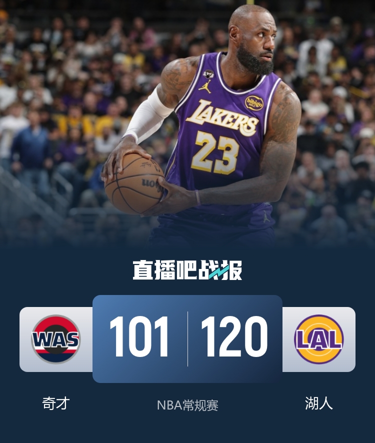 比赛开始,詹姆斯传射建功带队开局11-4领先,随后奇才连中三分迅速反超,双方势均力敌,比分始终紧咬,次节湖人开始发力,攻防两端压制对手,里夫斯连造杀伤,詹姆斯延续火力得分助攻一肩挑,湖人单节净胜22分,半场战罢以65-44领先奇才。易边再战,双方围绕20分的分差展开争夺,奇才连投带罚迫近比分,布朗尼助攻肯纳德压哨命中稳住局势,末节詹姆斯三分再度将分差拉开到20分,个人也拿到三双,湖人持续发力扩大优势,奇才无力追赶,最终,湖人120-101大胜奇才,主场过关。