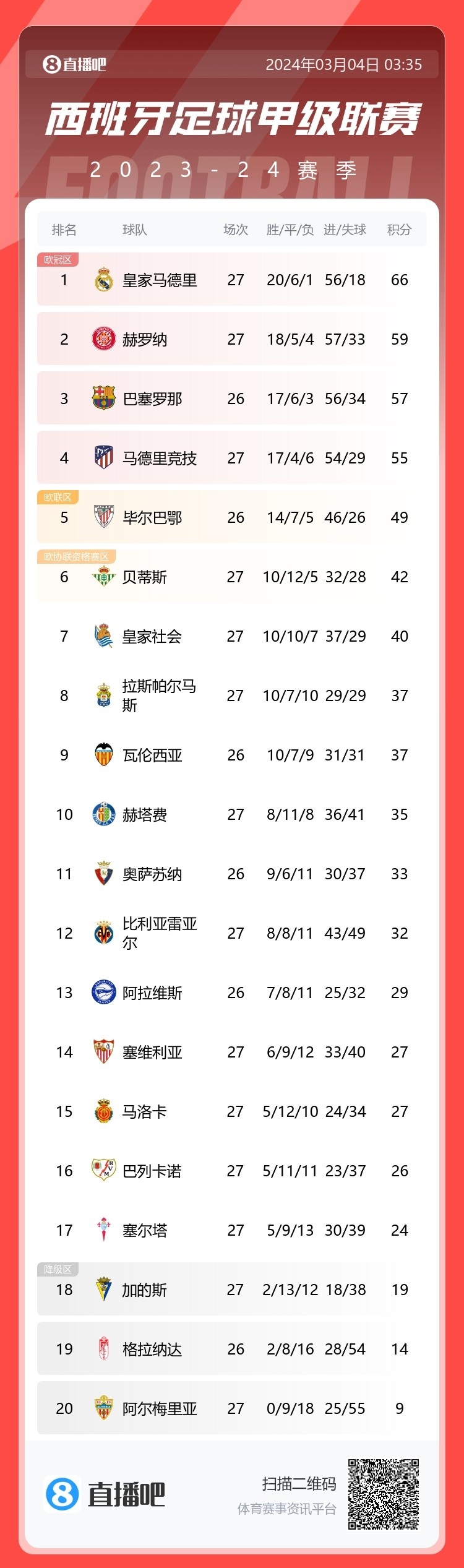 赫罗纳客场0-1不敌马洛卡,27轮后落后皇马7分暂居西甲第二