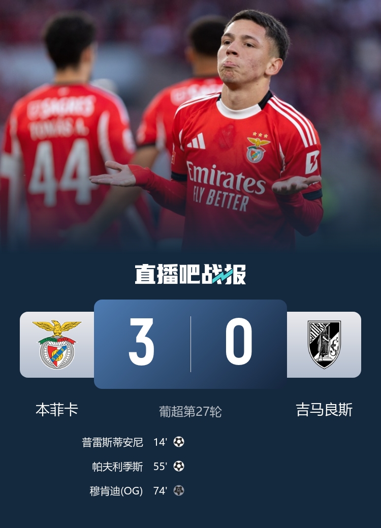 3月22日讯 北京时间3月22日2:00,葡超联赛第27轮,本菲卡在光明球场迎战吉马良斯。上半场,普雷斯蒂安尼抢点先拔头筹;下半场,里奥斯再次抢断后助攻帕夫利季斯破门,穆肯迪自摆乌龙。最终本菲卡以3-0击败吉马良斯。积分榜方面,本菲卡多赛一场积65分排名第二,距离榜首波尔图4分,吉马良斯积32分排名第九。