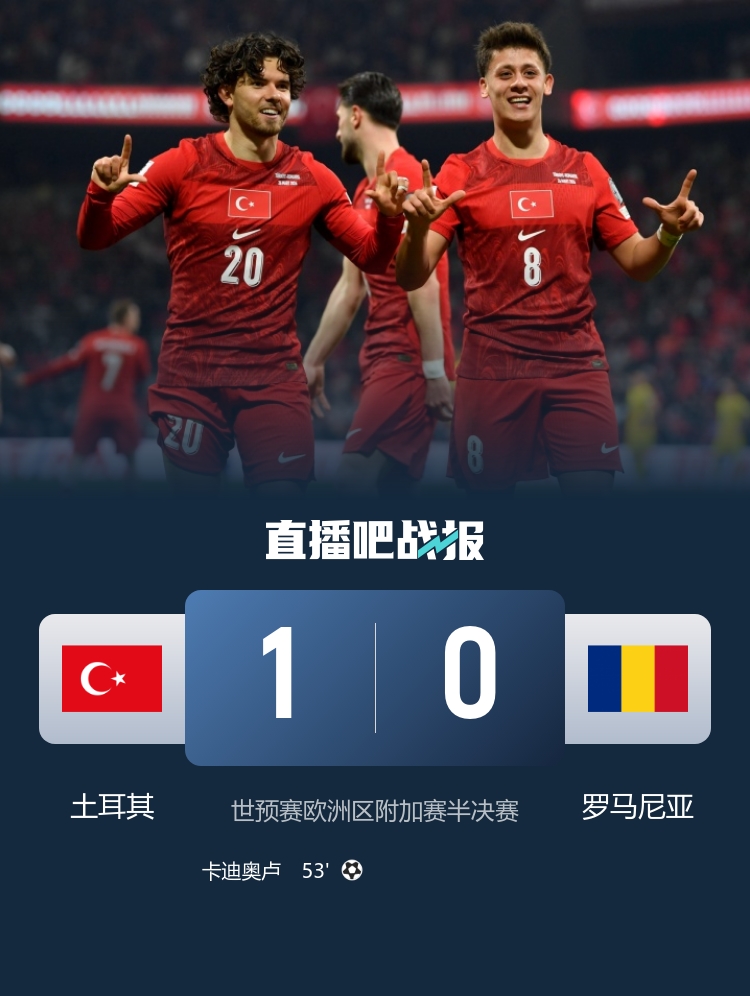 3月27日讯 北京时间3月27日凌晨1时整,世预赛欧洲区附加赛半决赛在贝西克塔斯公园球场展开角逐,土耳其主场迎战罗马尼亚。上半场土耳其6脚射门未果,下半场居莱尔长传助攻,卡迪奥卢打破僵局,伊尔迪兹中框。最终土耳其主场1-0战胜罗马尼亚晋级附加赛决赛,决赛将迎战斯洛伐克与科索沃之间的胜者。