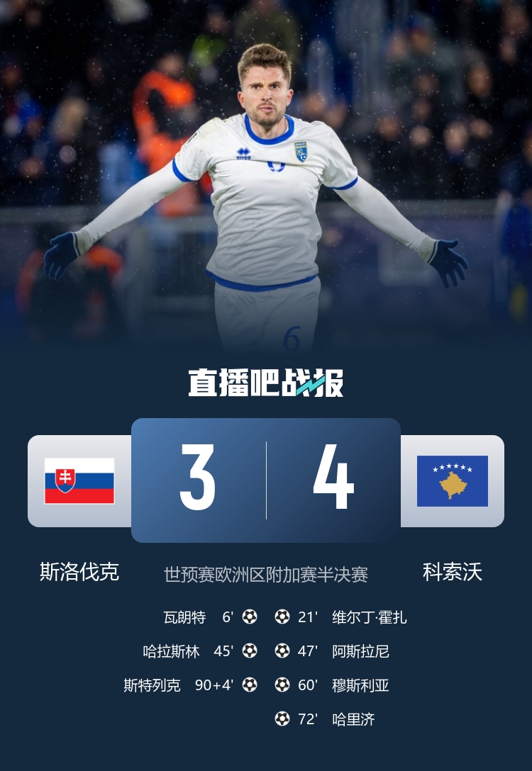 3月27日讯 北京时间3月27日凌晨3时45分,世预赛欧洲区附加赛半决赛在特赫尔内波勒球场展开角逐,斯洛伐克主场迎战科索沃。上半场瓦朗特先拔头筹,哈拉斯林传射+中柱,霍扎扳平,下半场阿斯拉尼头球追平,沃伊沃达两助攻,穆斯利亚任意球反超,哈里济补射破门,斯特列克补时扳回一城。最终科索沃客场4-3逆转斯洛伐克晋级附加赛决赛,决赛将对阵土耳其。
