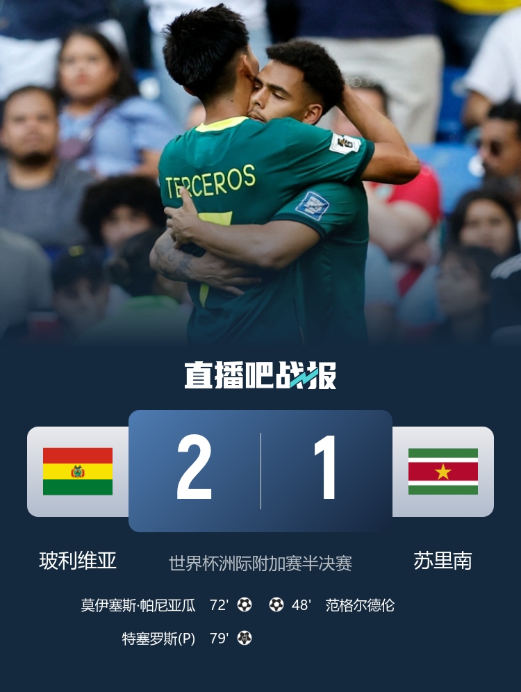 下半场补时10分钟,玻利维亚2-1苏里南。