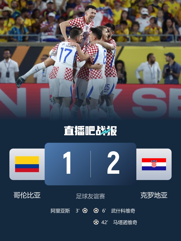 3月27日讯 北京时间3月27日7:30,足球友谊赛,哥伦比亚在美国奥兰多体育场迎战克罗地亚。上半场琼·阿里亚斯破门,武什科维奇进球帮助克罗地亚扳平,尾声阶段马塔诺维奇帮助克罗地亚反超比分,哥伦比亚暂1-2克罗地亚;下半场佩塔·穆萨中柱,最终哥伦比亚1-2克罗地亚。