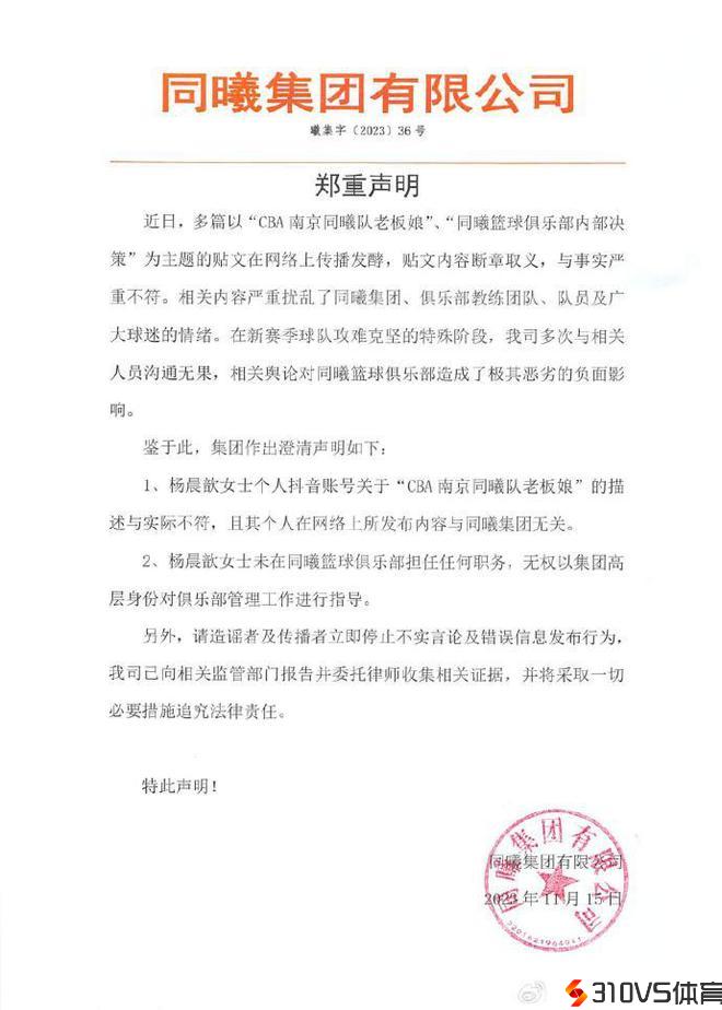 杨晨歆女士并未在俱乐部担任职务,她在网络上关于“CBA南京同曦队老板娘”的描画与理想不符,且其无权以集团高层身份对俱乐部管理任务停止指点。
