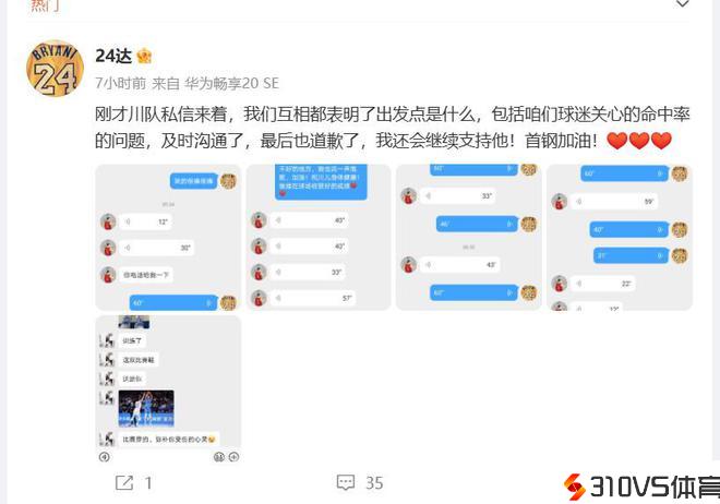 这位网友在社媒晒出两人的私信截图并写道:“刚才川队私信来着,我们相互都标明了动身点是什么,包括我们球迷关心的命中率的效果,及时沟通了,最后也抱歉了,我还会继续支持他!首钢加油!”