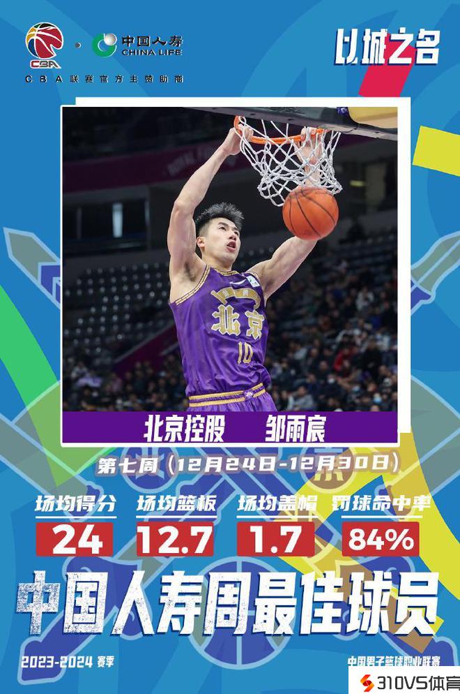 CBA官宣周最佳:邹雨宸本季两次本钱土首人 布莱克尼两战92+24