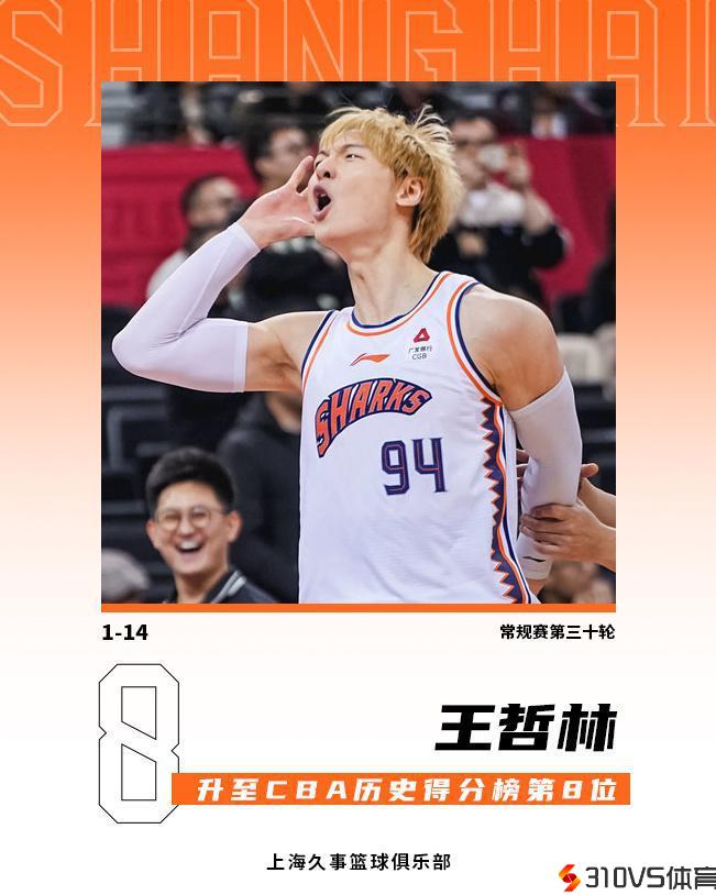 在本场竞赛之前,王哲林CBA生涯得分总计为8618分,位列CBA历史得分榜第9位,距离第8位的郭艾伦(8625分)仅差7分。