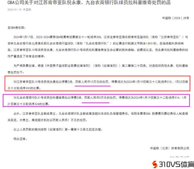 北时间1月19日,18日晚CBA开出赛季第17张罚单,对吉林队大外援拉科塞维奇和江苏队小将倪永康在竞赛中互殴作出处分。拉科塞维奇停赛两场罚款5万元,倪永康也停赛两场但罚款10万元,因此惹起不小的争议。在一些球迷看来,既然两团体都入手了,那处分结果就应该一样,才显得公允合理。