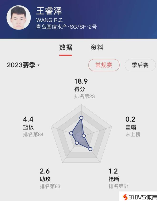 数据显示,王睿泽可谓CBA铁人,他场均上场40.6分钟,排名全联盟第一;场均可以命中3个三分球,排名全联盟第3。