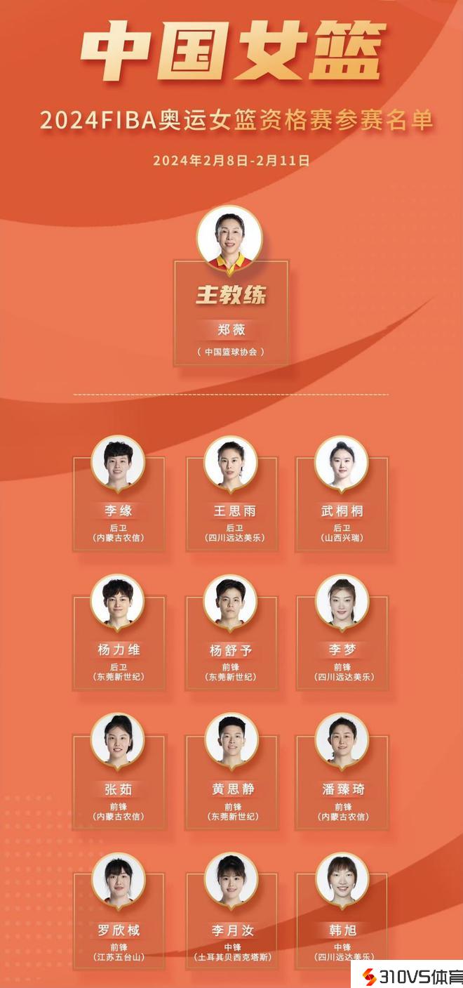 从最终的12人名单来看,郑薇最大限制地保管世界杯时期的主力阵容,仅杨舒予和罗欣棫两人没参与过2022年世界杯,这是一套阅历和才干以及未来希望兼具的最强阵容,中国女篮有希望在奥运资历赛取得3连胜,她们的对手区分是新西兰、法国以及波多黎各。