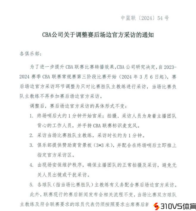 CBA调整赛后场边采访通知全文: