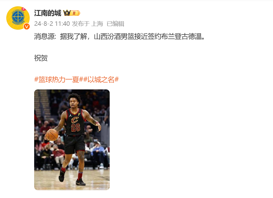 北京时间8月2日讯,根据@江南的城报道:山西汾酒男篮接近签约布兰登古德温。原文如下: