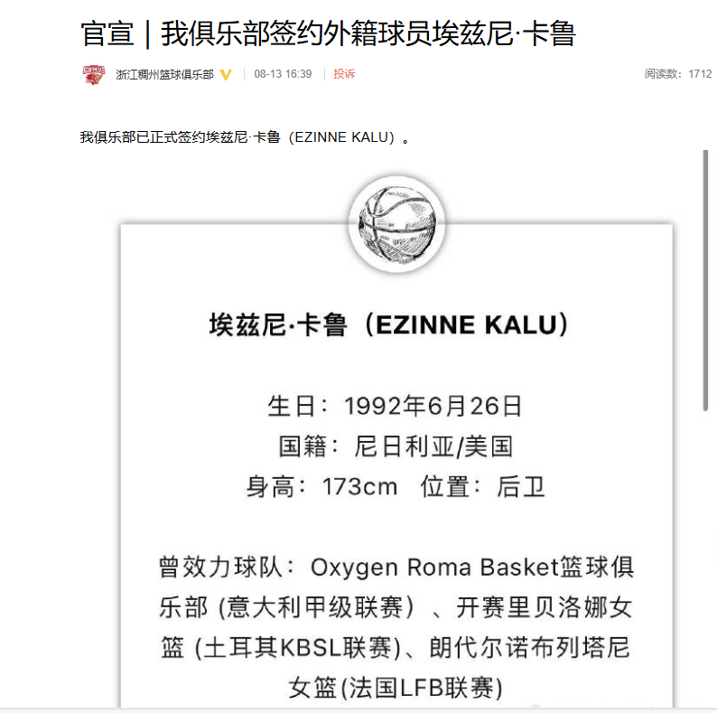 我俱乐部已正式签约埃兹尼·卡鲁(EZINNE KALU)。
