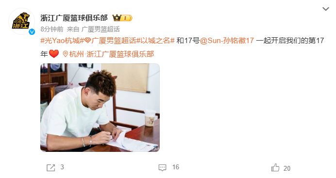 🌟广厦官方宣布与球队核心孙铭徽完成续约:和17号一起开启第17年