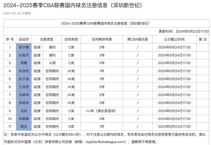 今日,深圳男篮更新新赛季国内球员注册信息:
