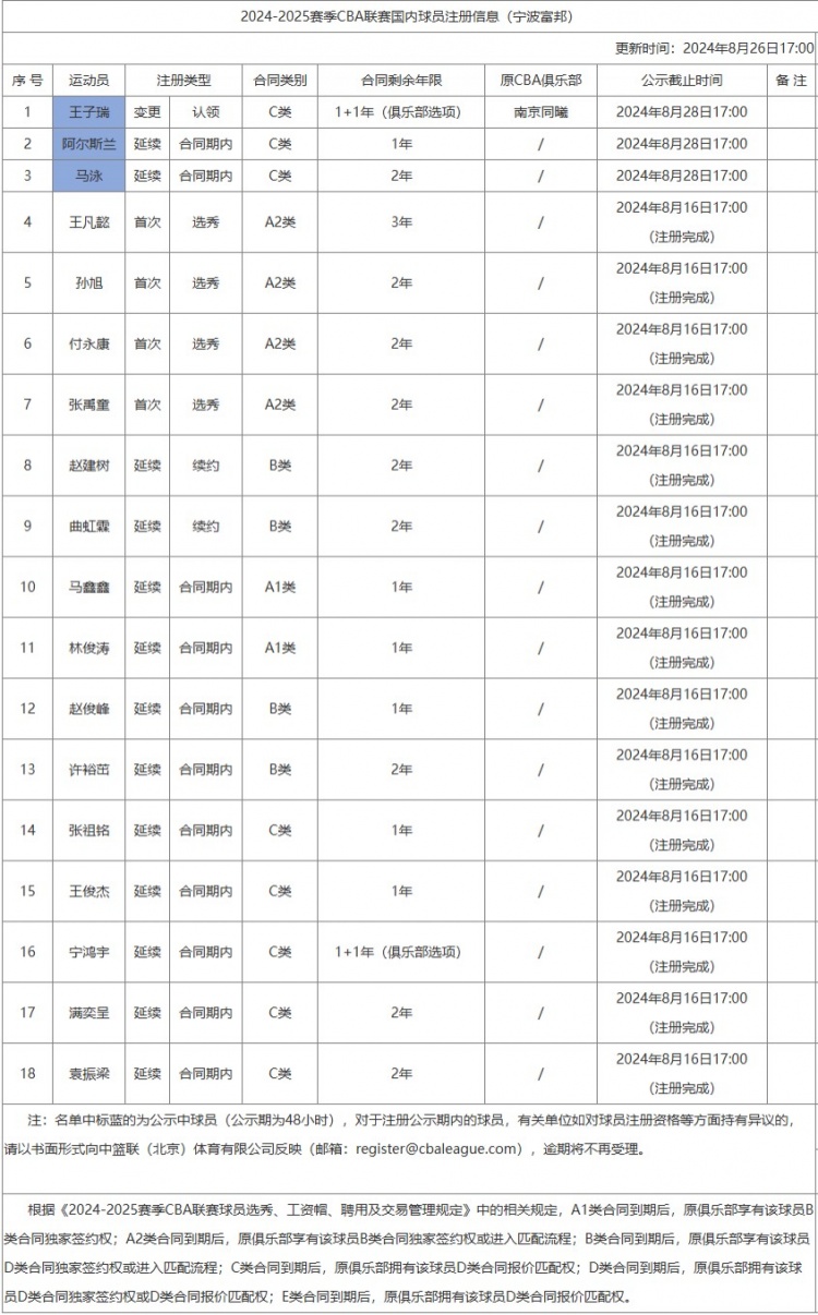 今日,CBA官网更新了2024-2025赛季宁波队注册名单,新增了阿尔斯兰和马泳以及王子瑞。