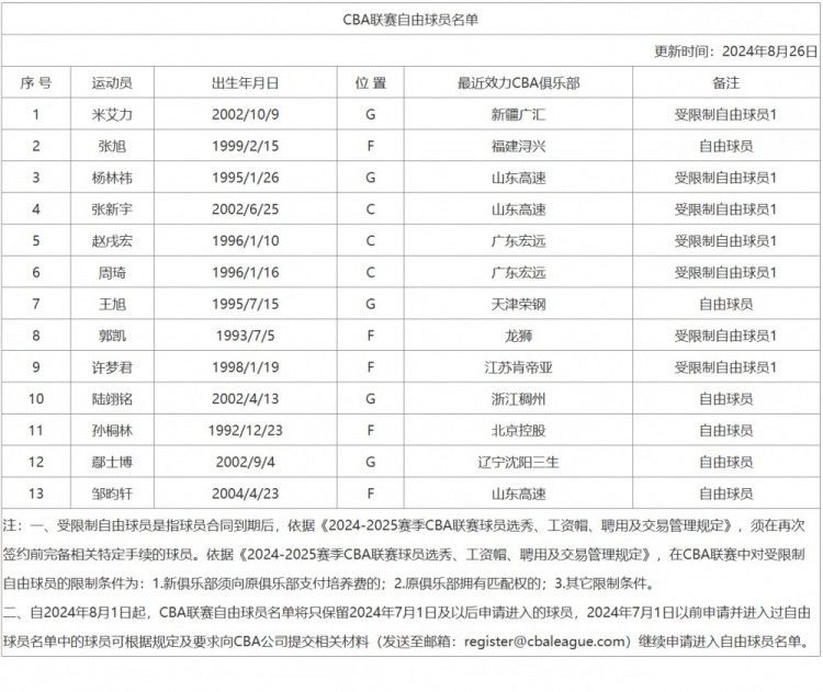北京时间8月26日讯,今日CBA官方更新了目前的自由球员名单。