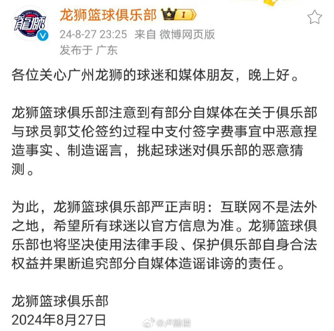 💪🏻广州龙狮辟谣:关于球队签约郭艾伦前支付签字费为谣言
