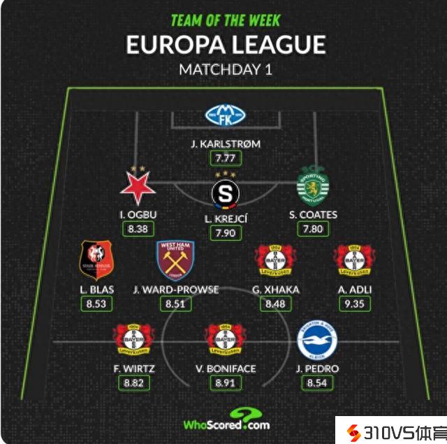 WhoScored欧联杯本周最佳阵:普劳斯、维尔茨在列,药厂4将中选