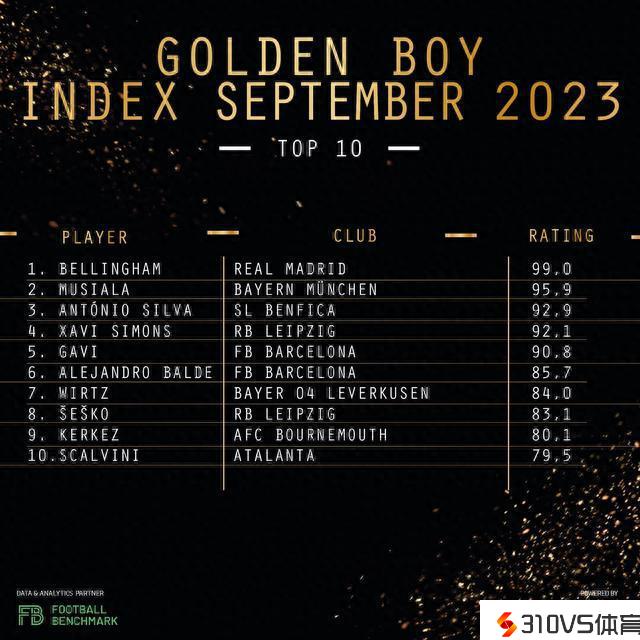 2023年金童奖最新排名:贝林厄姆领跑,穆西亚拉第二&加维第五