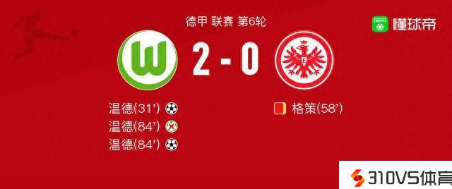 北京时间9月30日德甲 联赛 第6轮,沃尔夫斯堡主场对阵法兰克福。沃尔夫斯堡温德梅开二度。最终比分2-0。