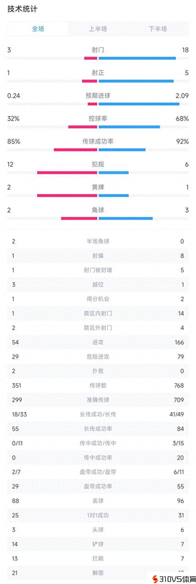 莱比锡vs曼城全场数据:射门3-18,射正1-5,曼城控球率68%