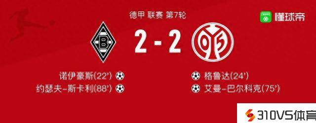 门兴格拉德巴赫vs美因茨球员评分:奥诺拉8.4分,奇万恰拉6.2分