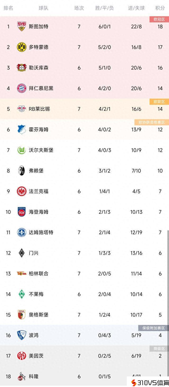 德甲积分榜:吉拉西帽子戏法助斯图加特登顶,多特四连胜第二