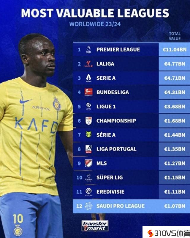 全球联赛总身价榜:英超超110亿欧大幅领跑,英冠第6