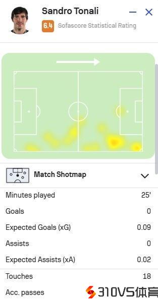 托纳利本场对阵多特蒙德数据:18次触球8次丧失球权,评分6.4