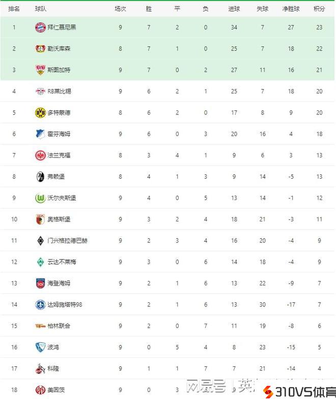德甲最新积分榜:拜仁8球横扫强势登顶,柏林结合惨遭10连败!