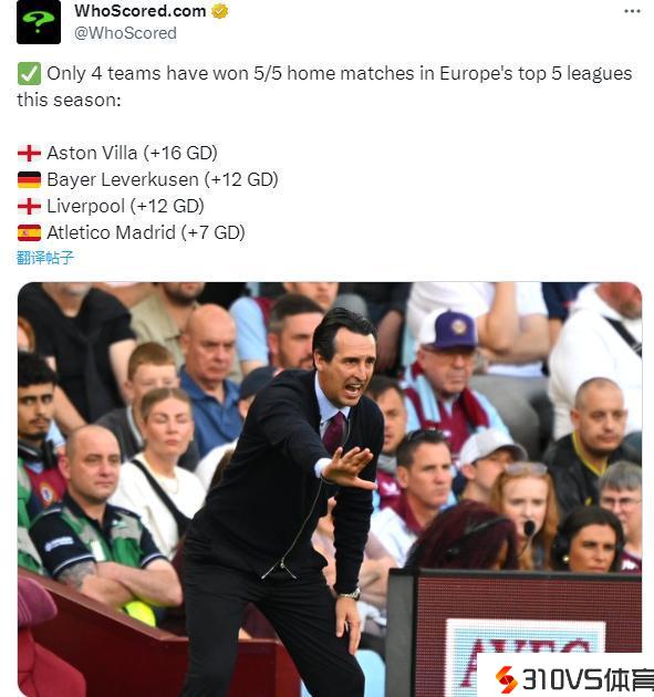五大联赛本赛季目前主场全胜球队:维拉、马竞、药厂、利物浦