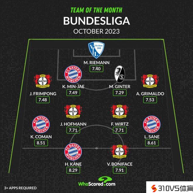 WhoScored德甲10月最佳阵:凯恩、萨内、金玟哉、维尔茨在列