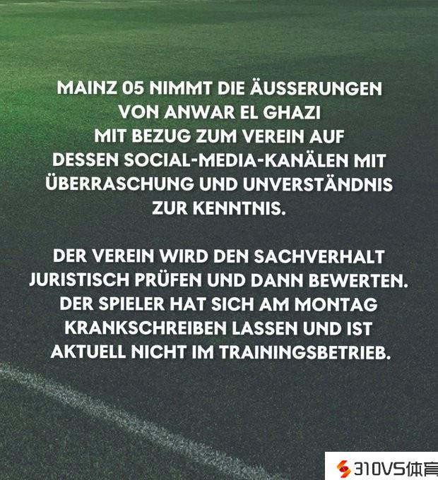 美因茨俱乐部明天针对球员埃尔加齐的言论发布声明,他们表示对埃尔加齐的言论表示惊讶和不解。
