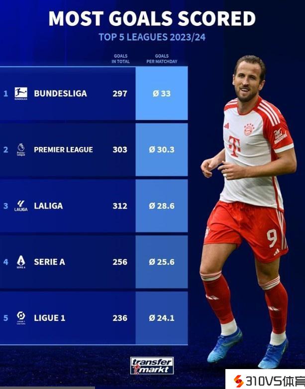 依据德转的统计,德甲本赛季每轮竞赛能打进33球,这是五大联赛中最多的。