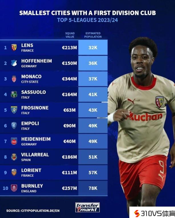 德国转会市场网列出本赛季五大联赛球队所在城市人口数排名,法甲球队朗斯所在城市人口数最少,德甲球队霍芬海姆所在城市人口数第二少。