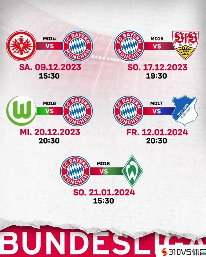 拜仁14-18轮竞赛时间:12月18日对阵斯图加特,21日客战狼堡