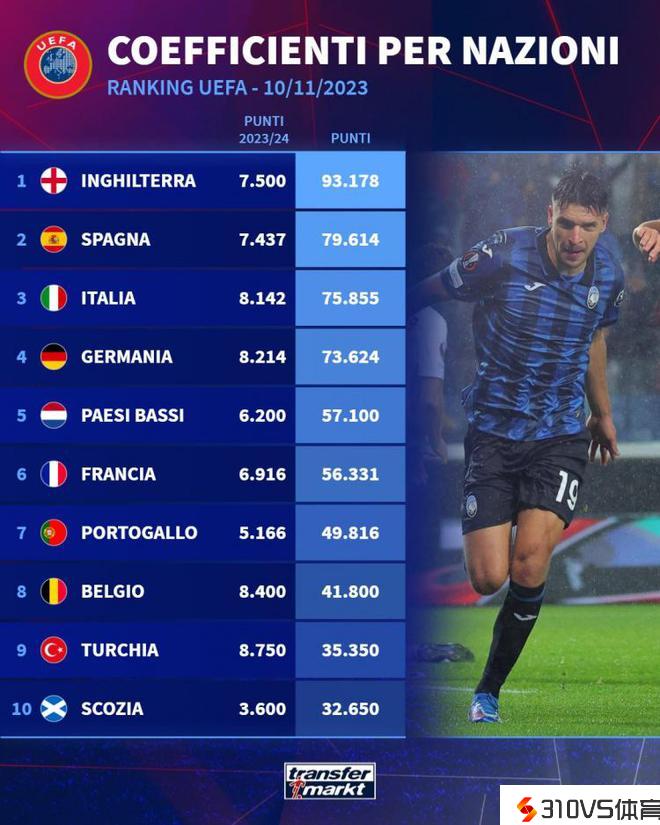 欧足联各国联赛积分更新,英超以93.178分领跑,西甲、意甲、德甲分列二到四位。