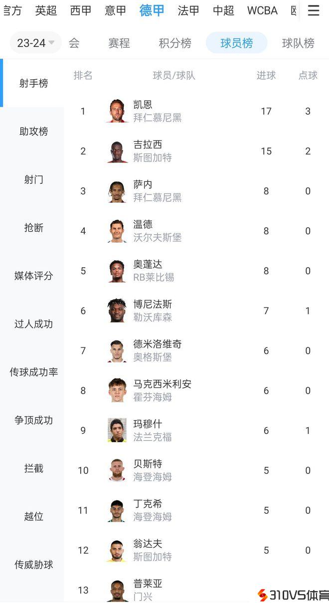 德甲射手榜:凯恩11轮17球居首,吉拉西9轮15球第二,萨内8球第三