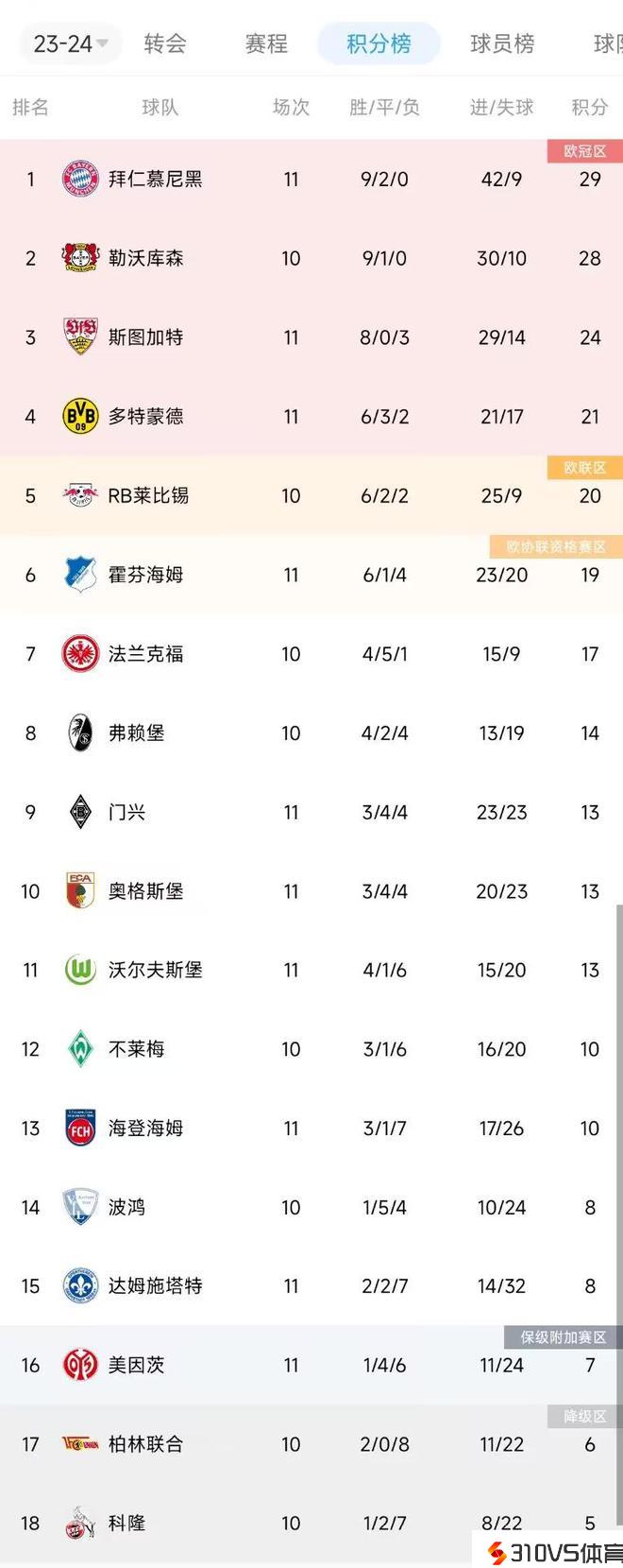 德甲积分榜:拜仁先赛暂升榜首,多特输球暂第4斯图加特第3
