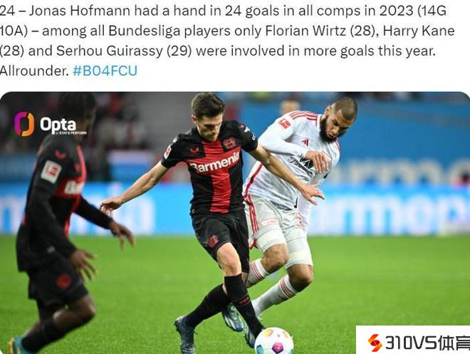 勒沃库森的另一条大腿!霍夫曼2023年直接参与进球数德甲第4
