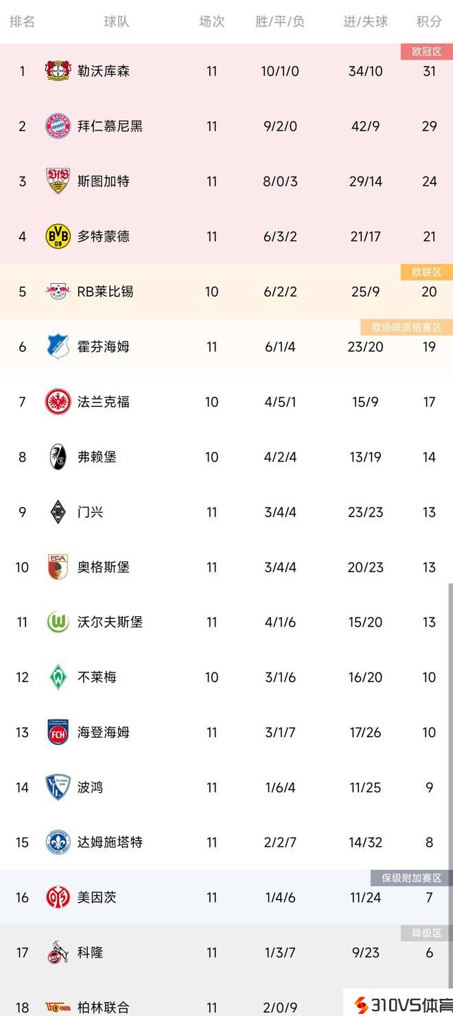 德甲积分榜:药厂联赛7连胜2分领跑 拜仁第二、多特第四