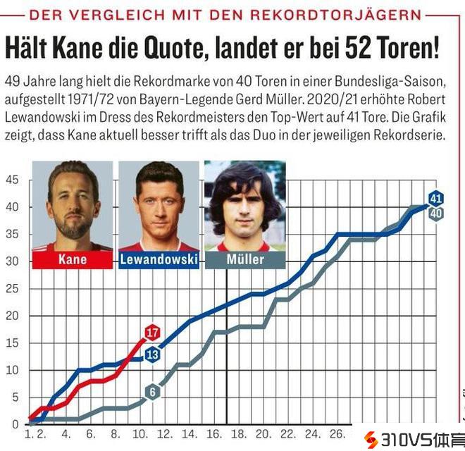 据《踢球者》统计,对比莱万和盖德-穆勒破纪录的赛季,凯恩本赛季德甲11轮事先的进球数曾经超越其他两人的同期数据。