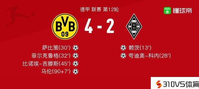 多特蒙德vs门兴格拉德巴赫球员评分:菲尔克鲁格8.8分,哈克6.0分