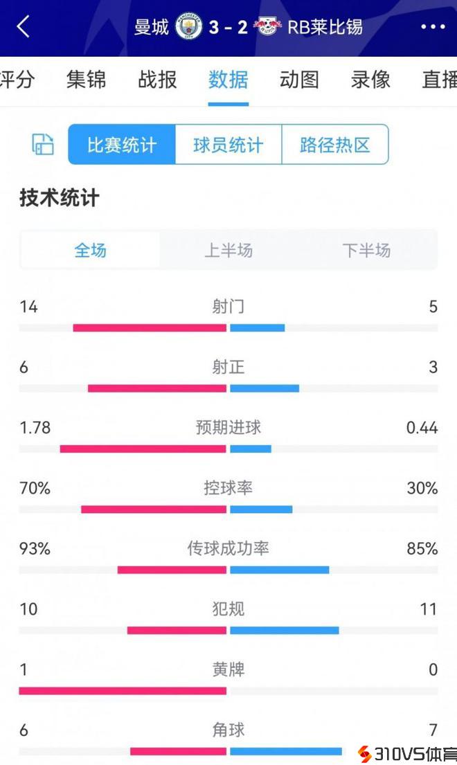 曼城3-2莱比锡全场数据:射门14-5,射正6-3,控球率七三开