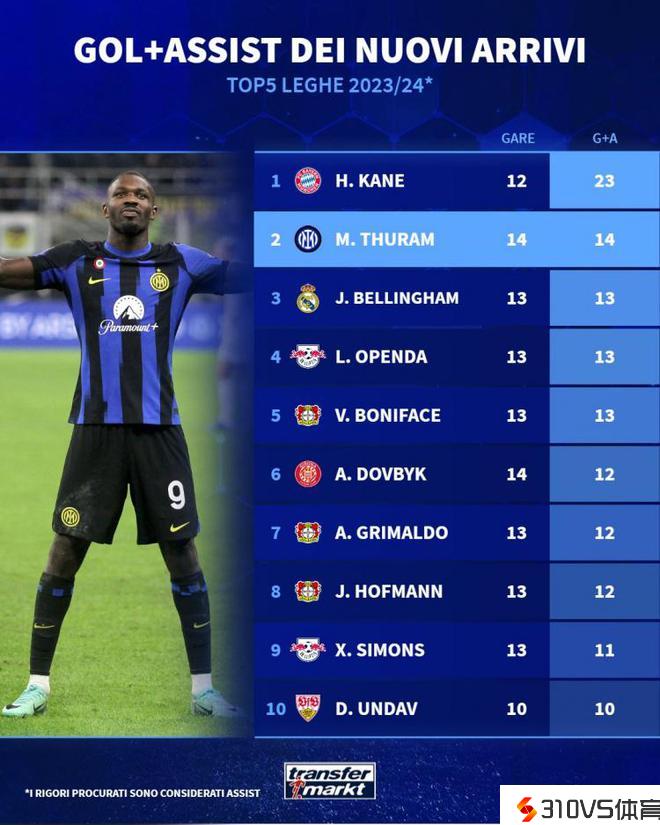 五大联赛新援参与进球榜:凯恩23球居首,小图拉姆14球次席
