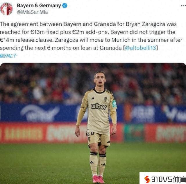 记者:拜仁签萨拉戈萨的初始转会费为1300万欧+200万欧奖金