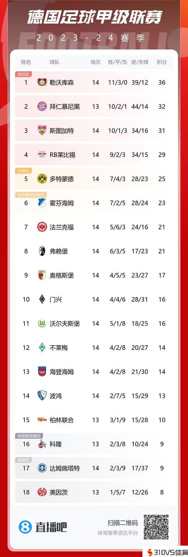 德甲积分榜:勒沃库森战平第3的斯图加特 14轮不败多赛1轮4分领跑